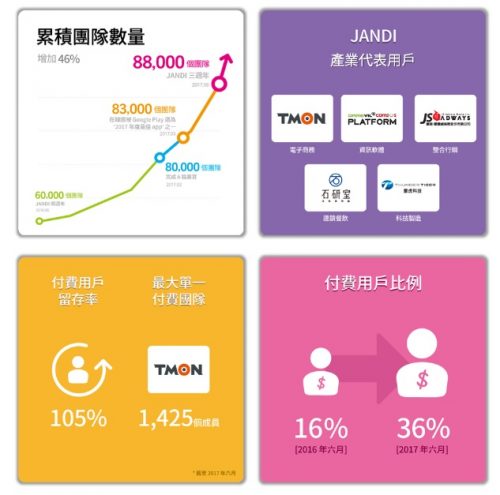 2017 年 3 月獲得來自 Ascent Capital Advisors 與南韓知名創業家兼 TicketMonster 執行長 Dan Shin 領投的 A 輪資金後,JANDI 在台灣與南韓市場有明顯的用戶增長。相較 2016 年 6 月,今年同月使用團隊數量增長 46%,其中,台灣用戶成長達 91%。原因在於高度獲得企業用戶青睞,包含零售連鎖與餐飲(例如:iFit 愛瘦身、繭裹子、笨豬跳 BBQ、石研室石頭火鍋等)、廣告行銷(例如:JS Adways)、資訊與製造(例如:雷虎科技)。而南韓則有 TicketMonster、Pizza Alvolo 等企業用戶,並且在南韓被 Google Play 商店評選為「2017 年度最佳 App 之一」。