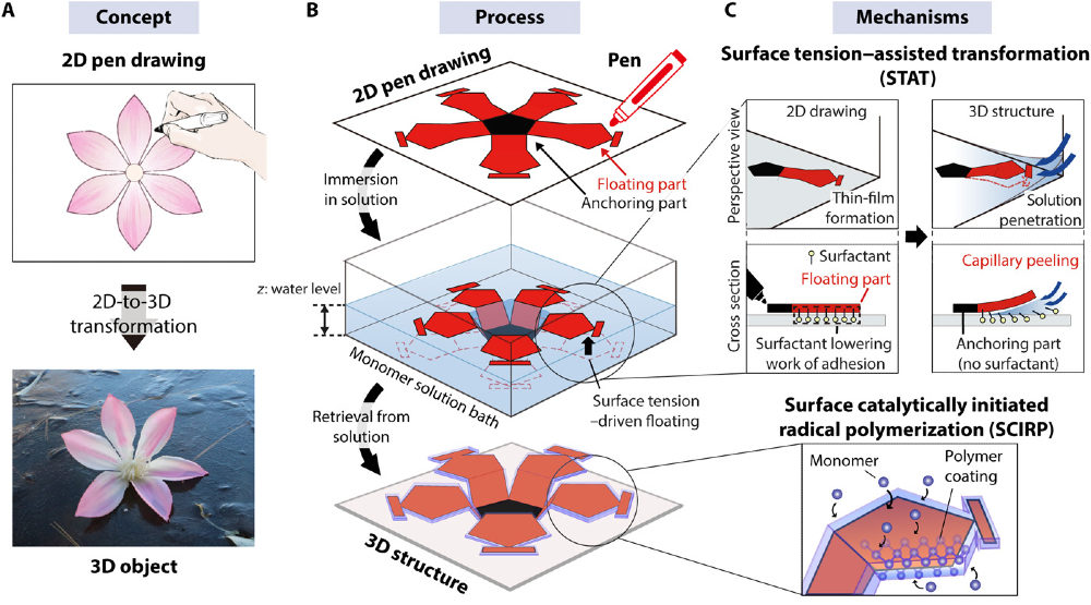他們希望透過開發新型 2D 轉 3D 技術,將畫筆下原本 2D 形狀轉換成 3D 物體。這基於形變機制,研究人員稱為「表面張力輔助轉化」(surface tension-assisted transformation,STAT)。