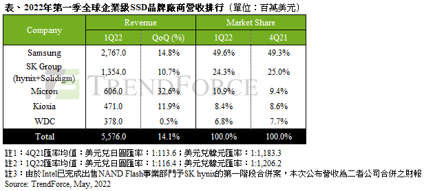 據 TrendForce 調查顯示,北美資料中心 2 月後隨零組件供應改善,推升訂單回溫,伺服器品牌廠在疫後回復正常至公司工作下,相關資訊設備資本支出增加帶動訂單的成長,再加上鎧俠( Kioxia)原物料污染事件促使部分急單價格上揚,推升第一季企業級 SSD 領域整體營收達 55.8 億美元,季增 14.1%。
