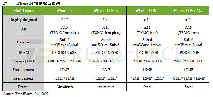 值得一提的是,蘋果今年下半年推出的iPhone 14系列將同樣推出四款新機,有別於以往,當中較受矚目的是僅於Pro系列採用最新處理器,除了顧及終端價格策略外,也更能突顯市場定位差異,在高通膨引起消費行為改變的趨勢下,可望廣納更多客源。