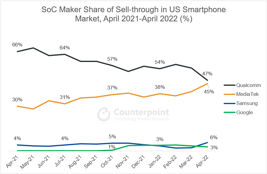 從出貨量來看,第一季聯發科以38%的市占率引領全球智慧手機SoC市場,第一季5G晶片出貨量年增20%,聯發科在其天璣700和天璣900系列的推動下,於中低階批發價格領域占據主導地位。高通在第一季獲得了30%的市占率,在目前的整體經濟環境以及疲軟的中國市場背景下,高通憑藉驍龍700和800系列的收入,其依然維持了在高階市場的定位。