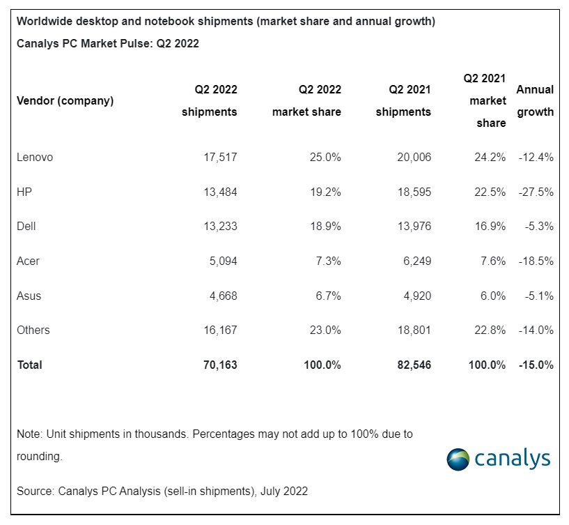 IT 之家報導,根據 Canalys 發布研究報告顯示,今年第二季由於中國針對新冠疫情採取了封控措施,使得生產中斷,對 PC 市場帶來了重大影響,桌上型電腦和筆記型電腦的總出貨量為 7,020 萬台、年減 15.0%,為自 2020 年第一季首次疫情封控以來的最低銷量。