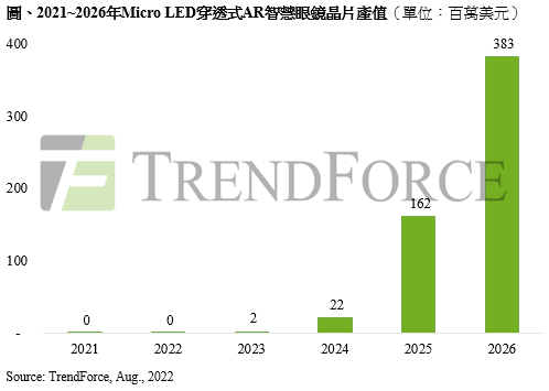自 2021 年至今全世界已經有超過 10 個品牌廠商推出 Micro LED 穿透式 AR 智慧眼鏡概念機,並且相關供應廠商紛紛精進 Micro LED 技術及加速擴廠,以因應後續的量產規劃,預估至 2026 年 Micro LED 穿透式 AR 智慧眼鏡晶片產值約為 3,830 萬美元,2023~2026 年 Micro LED 晶片的年複合成長率約為 704%。