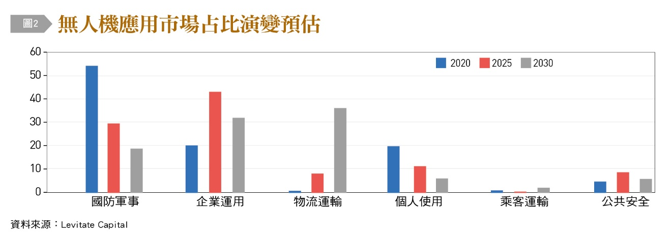雖然自2020年來,國防軍事為無人機最大市場,但隨著法規開放、傳統軍事研發科技逐漸導入民間企業,可預期私人企業用戶市占率2025年超越軍事運用與物流運輸,2030年成為無人機主流應用(上圖)。無人機可幫助企業在傳統仰賴大量人力管理和昂貴靜態監視系統的大面積業務,如農業、不動產、運輸管線與油氣礦場等,取得更有彈性效率的服務模式。隨之而來的高頻物流運輸業,除了需要有民航法規搭配及民眾接受度,也需要構建更複雜的自動化無人機交通管理系統,以避免無人機在人口密集區發生意外。至於如科幻電影的自動空中計程車,搭載你我脫離擁擠的路面交通,可能就要看前述應用發展的穩定度與規模,方可走向最終空中無人大眾交通網絡。