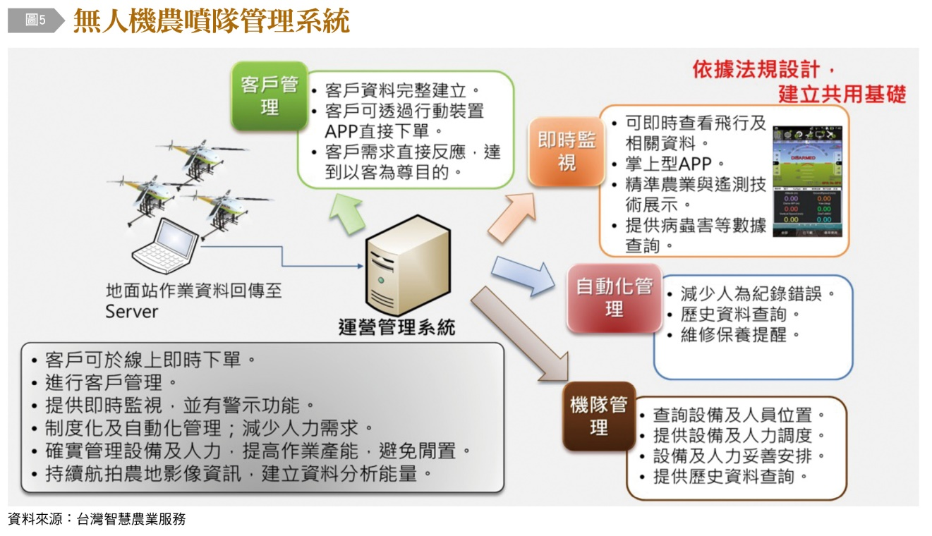 面對戰火引發的糧食危機,台灣更須正視無人機對農業的立即效應。全台主力農家27.6萬戶,有2.8萬戶缺工,2020年農業就業人口54.7萬人,10年內約11萬人離農。台灣農期短、作物具季節性,無法提供全年常態性工作,引進農業外勞仍難解決短期缺工問題(圖4)。如何建立有效無人機農業噴藥服務系統(圖5),可視為提升農經政策利多。