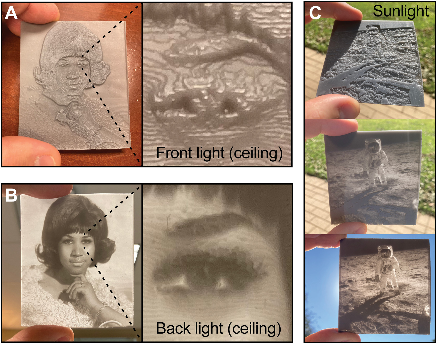 Lithphane 通常是薄薄半透明浮雕,材料是薄瓷或蠟,通常厚度小於 2 公釐。如下圖 A,Lithphane 在環境光或前照光下並不透明,但光從背後射來時(下圖 B 和 C),Lithphane 就會像數位圖片發光。光通過半透明材料散射,使較薄區域更亮,較厚區域較暗,形成可視化效果。薄薄浮雕便具備成為通用可視化數據形式的要素:既能讓視障者觸摸閱讀,也能讓普通人視覺觀看。
