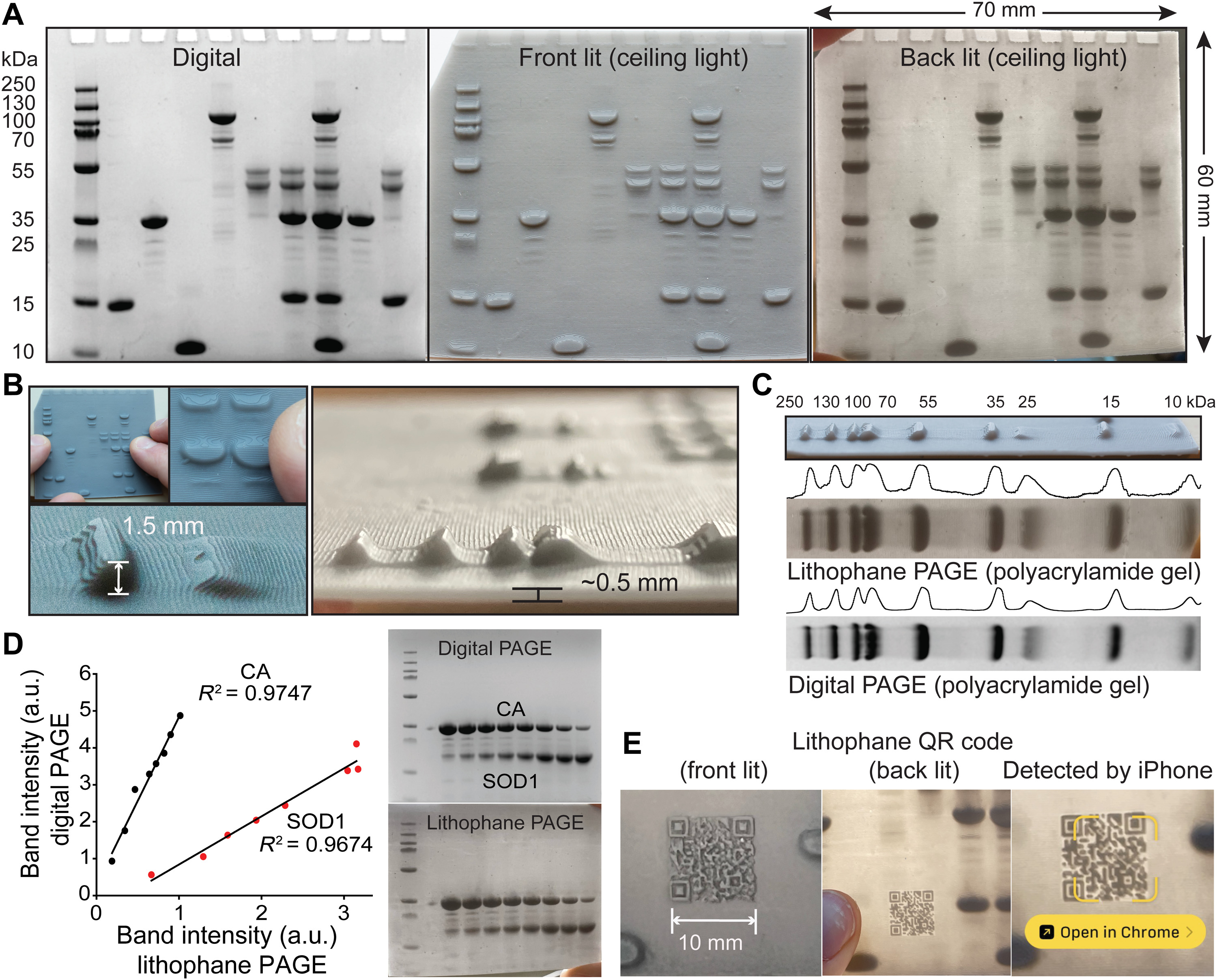 他們用小型商用 3D 印表機製作 Lithophane,成本少於 5 千美元。研究團隊對比實驗,比較視障者、蒙眼者和視力正常者用觸覺和視覺「讀」Lithphane 的效果。一開始團隊使用生物學最常見的圖片:SDS─聚丙烯醯胺凝膠電泳。如果能讓視障者「看見」電泳圖,那學習科學的機會就大大提升。