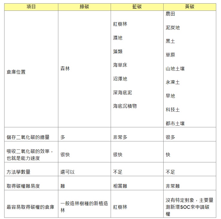 有這樣能舉一反三的讀者學生真是令人欣慰!還記得之前文章筆者整理的這張表嗎,在藍碳的部分確實有提到藻類與海草床。