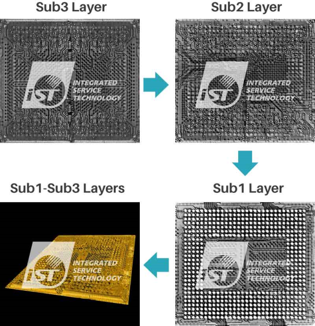 此案例不僅希望能夠逆向分析 BGA 中基板層(Substrate)走線,也期待可以得知封裝內晶粒(Die)金屬層(Metal)的布局分析,甚至能夠將 Substrate 與 Metal 布局分析圖進行疊圖透視,那我們是否可以先用 3D X-ray 拍 Substrate Layer 1-3 層,再研磨將 Substrate 去層,透過 OM 拍攝 Metal 層,得到兩種影像後,進行 Substrate Layer 1-3 層 + Metal 層上下疊圖透視?