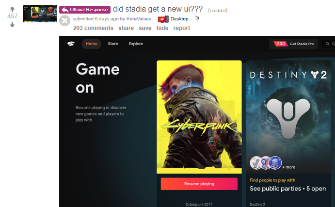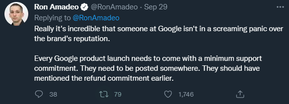 Stadia關閉公開後,Stadia社群主管留言下出現大量回覆。一位網友詰問:為什麼明知道今天就要關門了,你們昨天還推送更新?