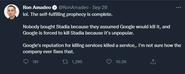 Google自證預言(self-fulfilling prophecy)再次應驗:沒人用Stadia,因大家都認為Google會殺掉它;Google被迫殺掉Stadia,因為沒人用它。