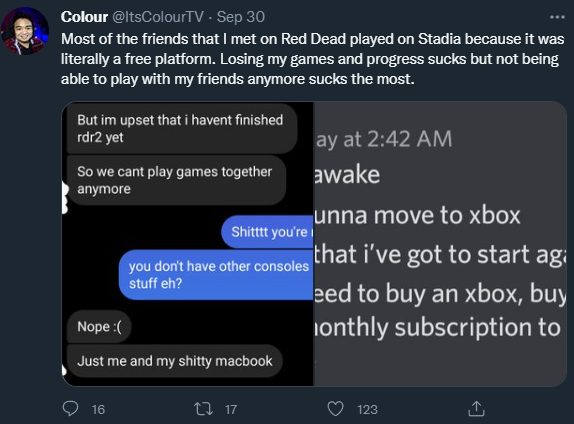 Colour說:「我在RDO認識的多數朋友都用Stadia玩,因是免費平台。失去遊戲進度當然糟糕,但更讓我難過的是不能和這些朋友一起玩了。」