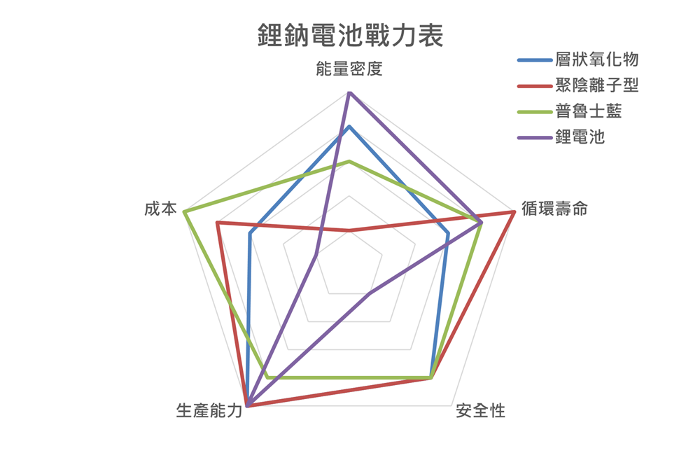 ▲ 鈉電池不同的正極材料路線與鋰電池的戰力表。