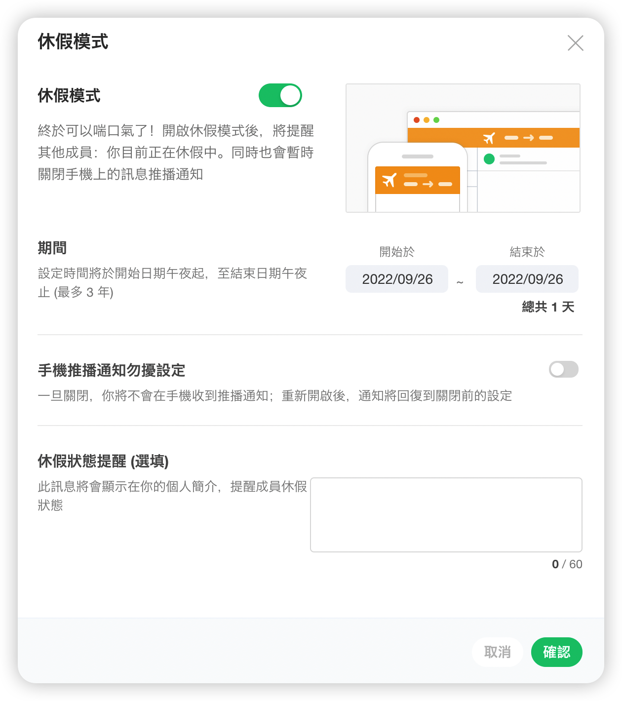 ▲員工可以在 JANDI 上將自己設定為休假模式,讓請假時排除訊息通知。(圖片提供:JANDI)