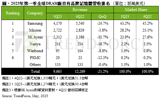 營收方面,三大原廠營收均下滑,三星(Samsung)自家品牌的新機備貨訂單有限,出貨量與平均銷售單價(ASP)同步下跌,營收約41.7億美元,季減24.7%。美光(Micron)第一季上升至第二名,主要是財報區間早於其他原廠,故受惠於去年底出貨訂單,為所有原廠中唯一出貨正成長,故營收衰退幅度最小,營收27.2億美元,季減3.8%。SK海力士(SK hynix)出貨量及ASP均下跌逾15%,營收衰退幅度31.7%為最高,約23.1億美元。