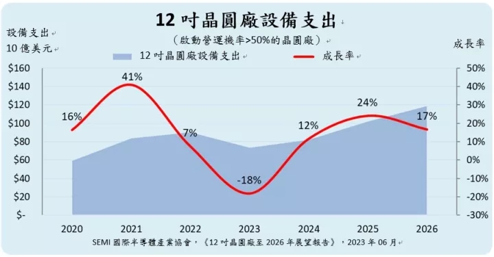 SEMI預估,2024年12吋晶圓廠設備支出將約820億美元,年增12%;2025年再增加24%,至1,019億美元;2026年可望攀高至1,188億美元,創新高。