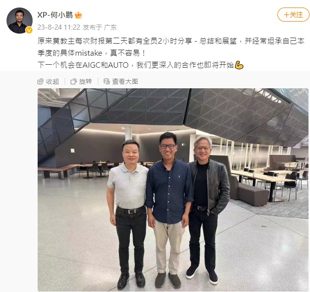 何小鵬並發布了自己與輝達掌門人黃仁勳,以及前小鵬自動駕駛副總裁吳新宙的合影。有網友透過視覺識別發現,該合照拍攝地點應該是輝達「Endeavor」辦公區,但無法確定拍攝時間。