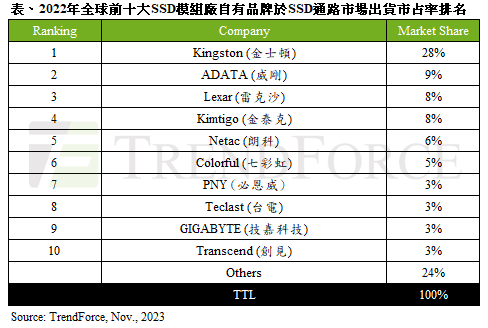2022年SSD出貨市占率前三大為金士頓(Kingston)、威剛(ADATA)、雷克沙(Lexar)。金士頓與威剛擁穩固的通路優勢,市占率均較2021年成長;雷克沙成長因預備上市前積極衝刺營收而逆勢成長;金泰克(Kimtigo)2022年積極拓展工控、OEM市場,帶動出貨量及市占率向上;朗科(Netac)除了企業級SSD屢獲政府訂單,通路SSD市場亦有競爭力,市占率與排名與2021年持平。