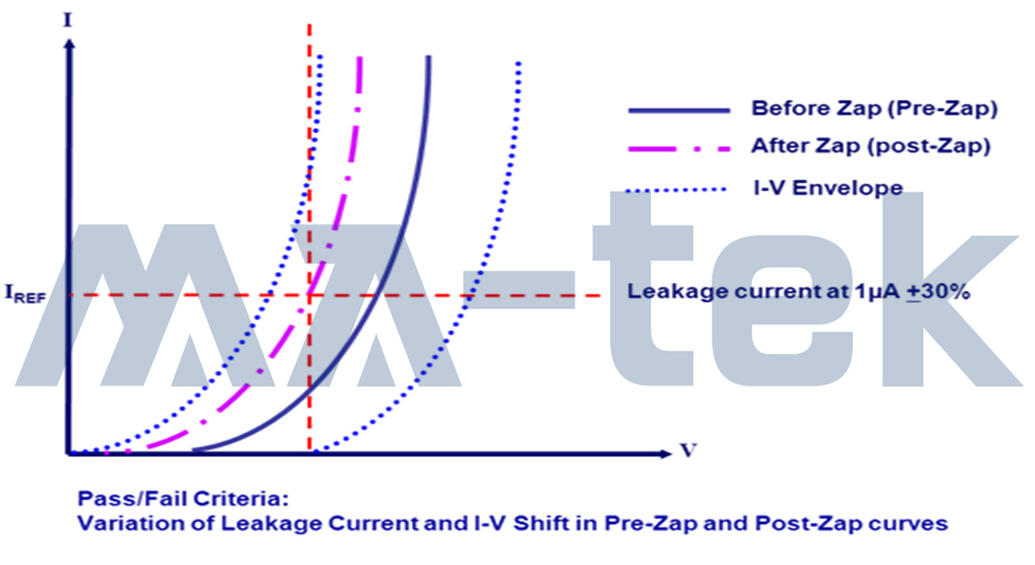 圖二:Zap 前後的 IV 變化,若 1uA 下的電壓變化達 30% 以上,判定此腳位 ESD Fail