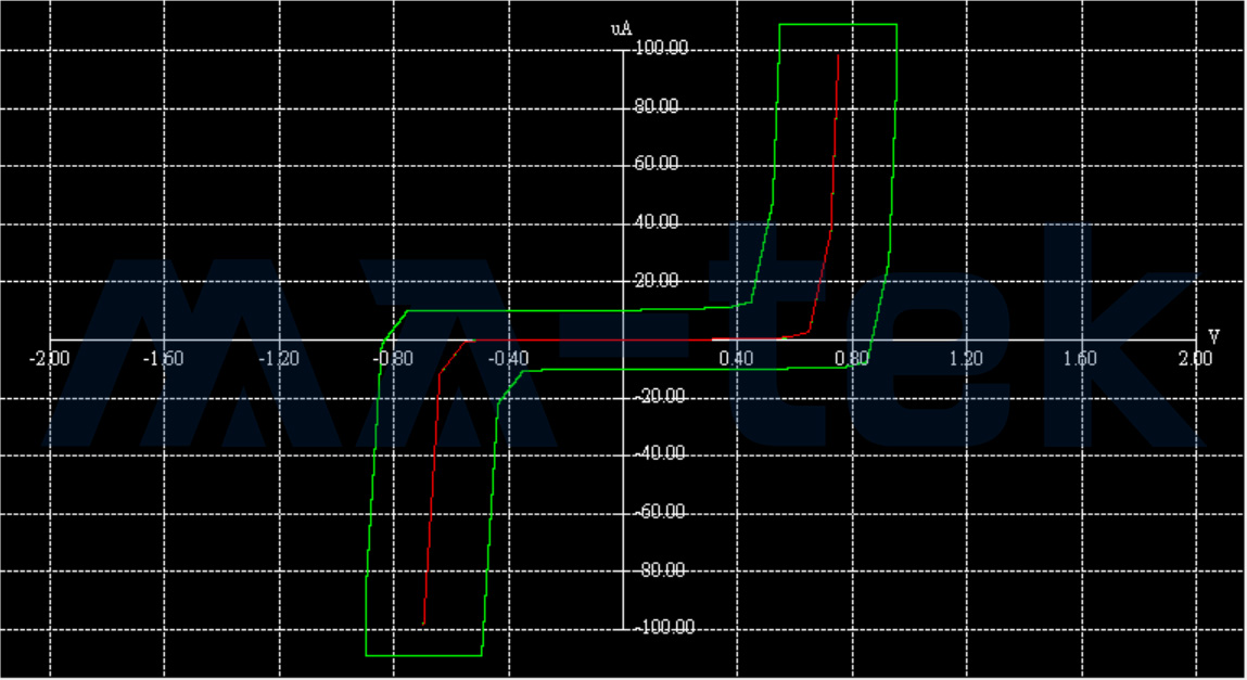HBM 與 CDM 依據規範是要測試完整的測試項,包含參數測試(Parametric Testing)和功能性測試(Functional Testing),如此才能逮到因 ESD 損傷而造成的故障現象。在參數測試方面,在自動測試機台(ATE)上即是測 Open/Short(OS)、漏電和 Power 端的靜態電流,但若以 ESD 測試機台來即時比較 ESD 測試前後的差異的話,可以用兩種方式來量測,第一種是在電流等於 1uA 時的電壓,若前後差異小於 30% 的話,便能通過 ESD 測試,如圖二所示;第二種是包絡線(Curve Compare Envelope),以 ESD 測試之前的 IV 曲線為參考,並以測試的最大電壓與電流的正負 10% 為調整值,將此正負值加諸在測試前的 IV Curve 即可得出一個區間範圍,只要測試後的 IV 在此範圍便是通過 ESD 驗證,如圖三所示。