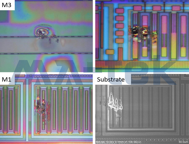若是已知毀損電路在 IO Cell,為了快速確認,可以執行全層次去除(Total Delayer)後,再以光學顯微鏡(OM)或掃描式電子顯微鏡(SEM)觀察,如圖四所示。