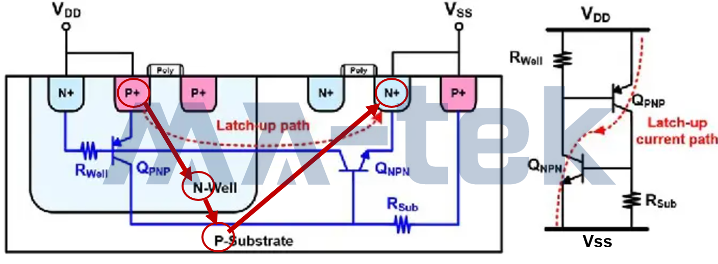 在我們所身處的環境中,靜電是無所不在的殺手,既然靜電無法完全預防,那麼為了能夠在電荷流經積體電路時全身而退,IC 設計上就會在引腳旁設計靜電放電(Electrostatic Discharge,ESD)防護電路保護晶片,就像在大樓頂端設置避雷針的目的一樣,當雷擊中大樓時,能夠有引流的作用,確保大樓內的電器不會受損。此外,由於元件結構的特性,所謂的閂鎖(Latch-up,LU)效應會造成積體電路在操作時有大電流的現象而引起功能上的問題,甚至會使得晶片永久損傷,這同樣也需要在晶片設計上來避免 LU 的問題。