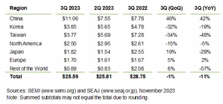 國際半導體產業協會(SEMI)統計,第三季全球半導體設備銷售 256 億美元,季減 1%,較去年同期減少 11%;中國銷售強勁,逆勢較去年同期增加 42%。