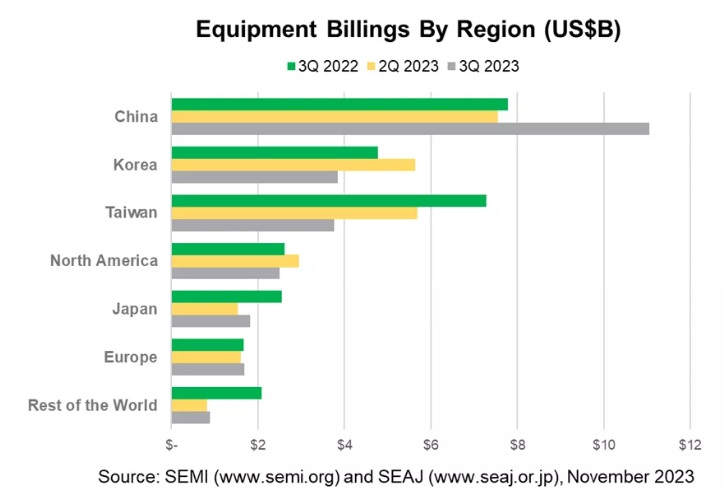SEMI指出,中國第三季全球半導體設備銷售達110.6億美元,季增46%,年增42%,銷售金額和成長幅度皆居全球之冠。