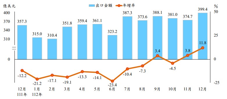 財政部今天公布2023年12月海關進出口貿易初步統計,12月出口金額399.4億美元、為16個月來新高,年增11.8%,連續2個月正成長,且幅度為近17個月最大;進口金額288.4億美元、年減6.5%,連14黑,為史上第二長衰退週期。