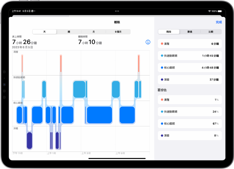 - 階段:iOS 16 或以上版本,以及 watchOS 9 或以上版本,可檢視「清醒」、「快速動眼期」、「核心睡眠」、「深睡」的時長與百分比。