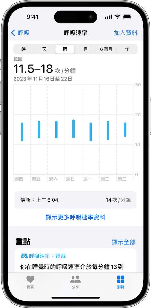使用者可以檢視最近一天、週、月或半年內的睡眠紀錄。輕點「顯示更多睡眠資料」,然後選擇項目類別,就能看見其他睡眠詳細資訊。