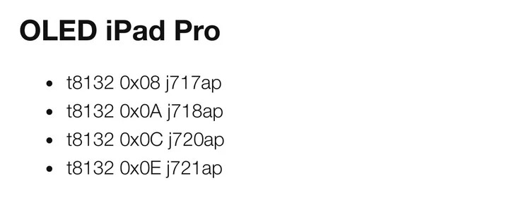 以蘋果過去型號標籤碼命名習慣,「iPad16」對應大概就是新 iPad Pro,但和之前不一樣的是,iPad 似乎跳過一版。搭載 M2 的設備標籤碼為「14」(如 2022 款 iPad Pro「iPad14,3」和 2022 款 MacBook Air「Mac14,5」),M3 設備是「15」(目前只有 Mac)。新 iPad Pro 標籤碼為「iPad16,x」而不是「iPad15,x」,可能代表新 iPad Pro 並不是 M3 晶片,而是跳至還未發表的 M4 晶片。