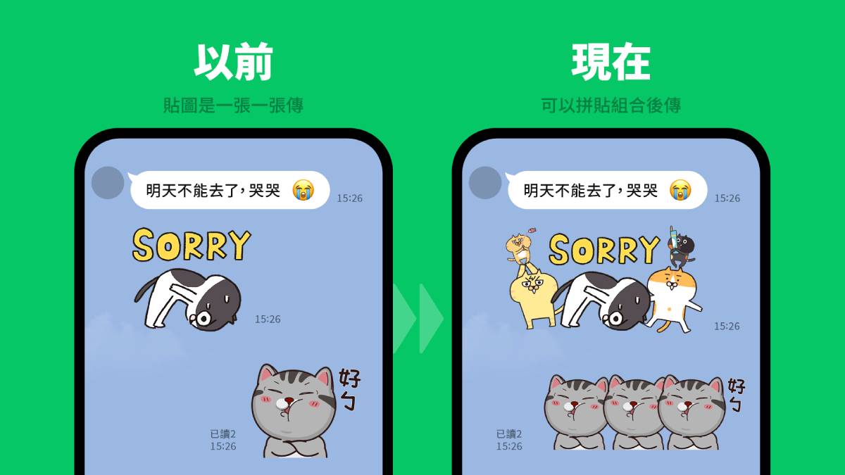 透過「貼圖拼貼樂」,用戶可挑選最多 6 張貼圖、甚至是不同角色 IP 的貼圖進行組合,經過放大縮小、調整角度、排列位置後,可在 LINE 聊天室一次性發送。拼貼完成的貼圖可於一對一、群組聊天室使用,目前只能在手機版操作和觀看,電腦版日後也會支援。