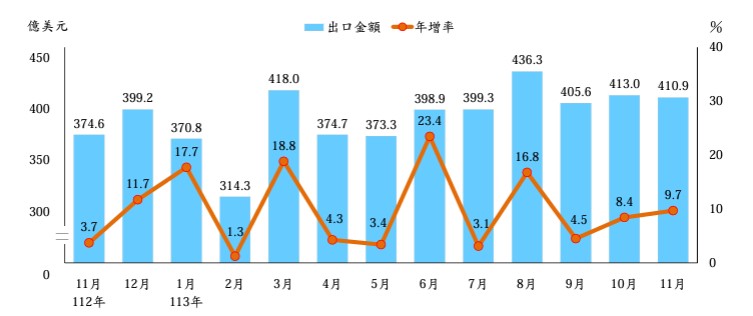 財政部今天公布最新海關進出口貿易初步統計,11月出口金額410.9億美元,年增9.7%;進口金額331.6億美元,年增19.8%。出進口互抵後,11月出超79.2億美元。