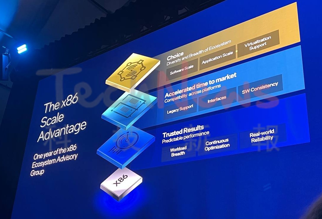 此外,CPU 在代工智慧工作負載繼續扮演關鍵角色。英特爾強調 x86 作為主流 CPU 平台的重要性。英特爾正積極與 AMD 和眾多夥伴「x86 生態系統諮詢小組」開放合作,以推動 x86 生態系統的標準化和相容性,例如中斷處理和向量指令 (AV extend) 方面的標準化。因此,英特爾重申對開放式乙太網路標準化技術的支持,這對於將所有不同組件拼接成最佳化的機架至關重要。英特爾積極參與 OCP 及「開放AI系統」。