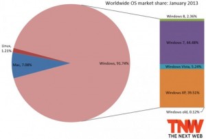 根據市場調研機構 Net Applications 發布最新操作系統市場報告顯示,2013 年 1 月份微軟 Windows 作業系統依然占有個人電腦市場絕對領先地位,前五名除蘋果 Mac OS X 10.8 擠上一個名額外,其餘均是來是微軟的 Windows 系統,而推出的 Windows 8 也在市場中躋身前五名。 繼續閱讀..